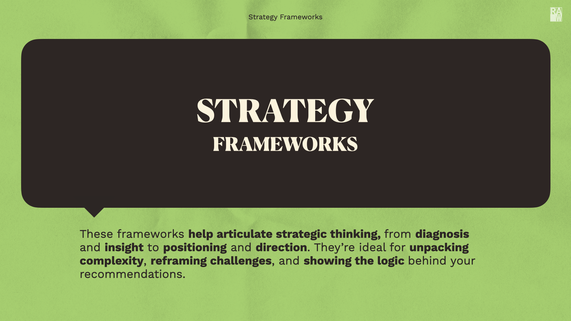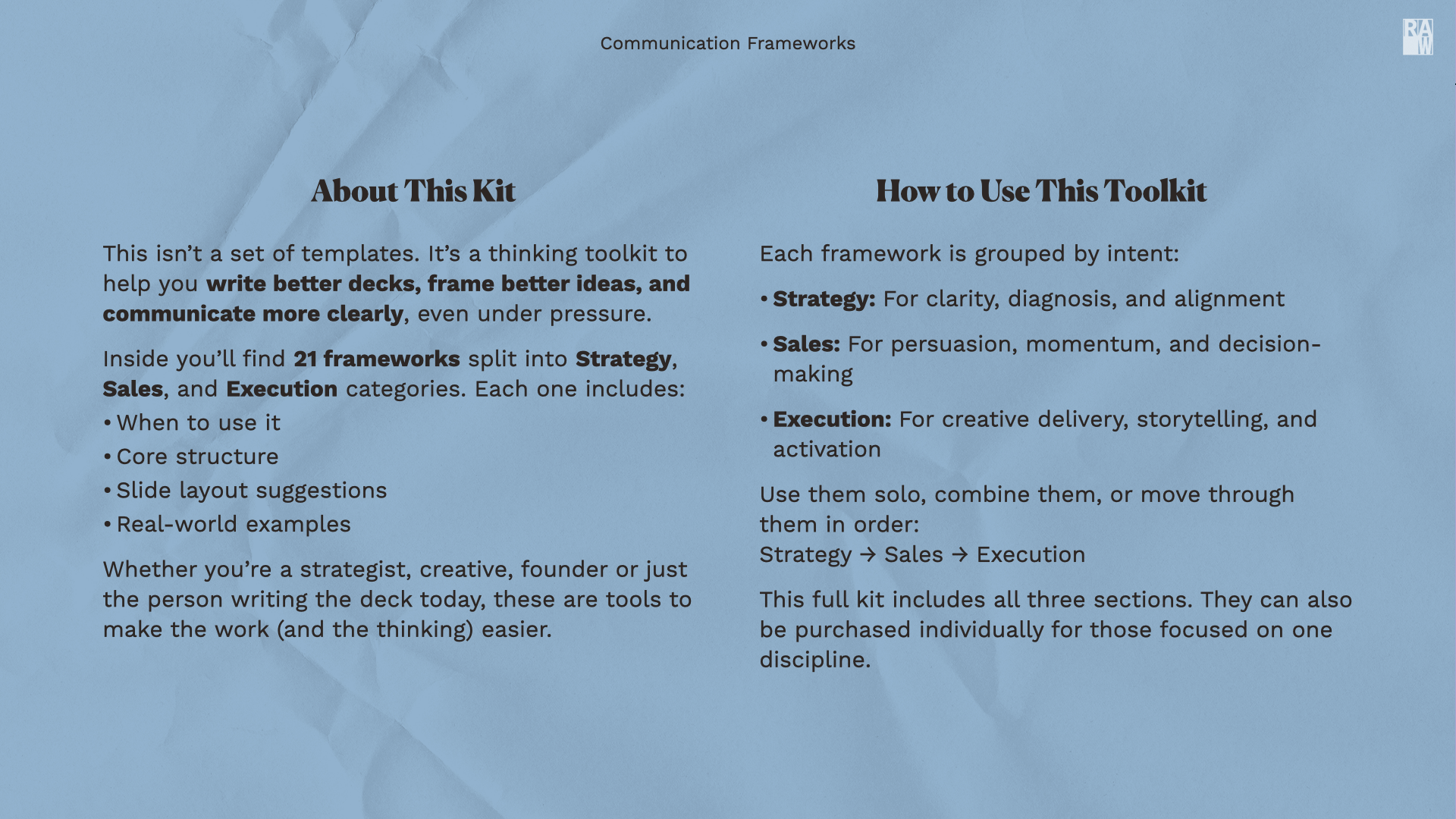 This isn’t a template pack. It’s a thinking toolkit for strategists, creatives, and anyone who has to make ideas make sense, fast.